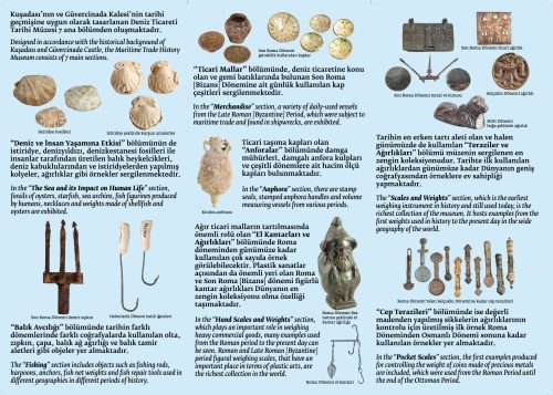 İlk olarak deniz yaşamı ve deniz yaşamının insan yaşantısına etkisi işlenmiştir. Deniz yaşamından örnekler olarak istiridye, deniz yıldızı, deniz kestanesi fosilleri ile insanların etkileri olarak ürettikleri balık heykelcikleri, deniz kabuklularından yapılmış kolyeler, istiridye şekilli kolyeler, ağırlıklar gibi örnekler sergilenmektedir. Daha sonraki bölümde, balık avcılığın tarihsel gelişmeleri görülmektedir. Balık oltalarının ikibin yıllık gelişmeleri, zıpkınların tarihsel gelişimi, çapalar, balık ağ ağırlıkları, balık tamir aletleri bulunmaktadır. Daha sonraki bölümde ise deniz ticaretine konu olan ve ticari gemi batıklarında bulunan günlük kullanılan kap çeşitleri sergilenmektedir. Yine, gemilerde diğer ticari malların taşımacılığında kullanılan taşıma kapları olan anfora örnekleri de sergilenmektedir. Anforalar bölümünde anfora damga mühürleri, damgalı kulplar ve diğer dönemlere ait hacim ölçü kapları de yer almaktadır.